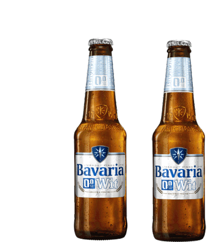 Two identical amber glass bottles of Bavaria 0.0% Wit beer, chilled and side-by-side, with blue and silver labels.