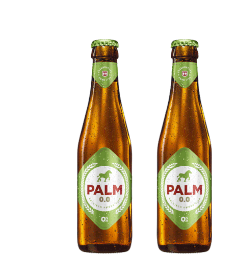 Two bottles of PALM 0.0 Belgian Abbey Beer from Swinkels Family Brewers, featuring green labels and a refreshing look.