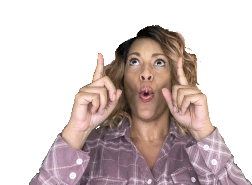 Holly Logan points both index fingers upwards, signaling to swipe up or look for information. Perfect for calls to action.