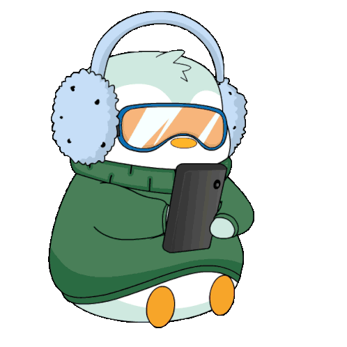 A cute pudgy penguin in earmuffs and goggles scrolls through content on a smartphone, looking at a cat on screen.