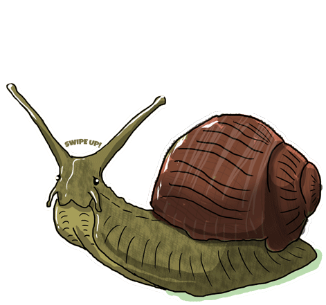 An animated snail sticker with a brown shell and green body, featuring the dynamic 'SWIPE UP!' call to action.