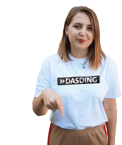 Dasding Valeria points down, indicating a 'Swipe Up' action for social media.