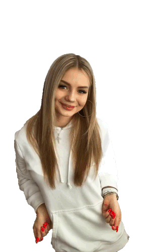 A blonde girl in a white hoodie smiles and gestures 'swipe up' with both hands, looking directly at the viewer.