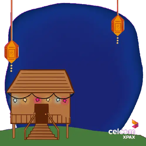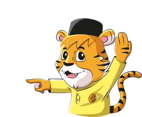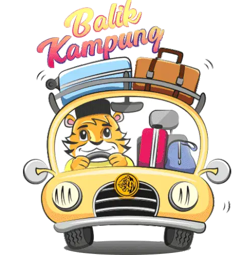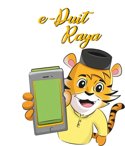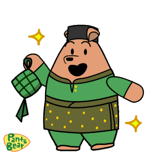 Pants Bear celebrates Hari Raya, happily holding a ketupat in a traditional green Baju Melayu outfit with a songkok.