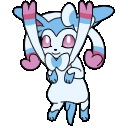 An adorable pixel art Sylveon from Pokémon is depicted climbing or hanging with its arms playfully raised.