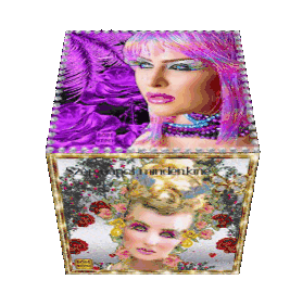 Szia Hello sticker featuring a rotating cube adorned with glamorous women's faces, vibrant colors, and intricate designs.