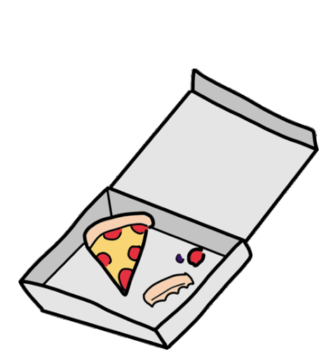 A cartoon pizza box with a single slice of pepperoni pizza, a crust, and crumbs inside.