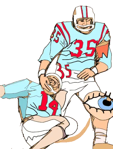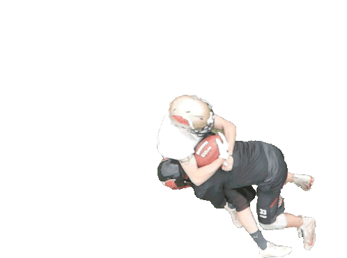 Two American football players in action, one tackling the other who is holding the ball during a game.