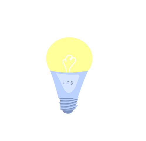 Animated sticker illustrating climate action, showing LED bulbs, families saving money, wind turbines, green jobs, and solar-powered homes.