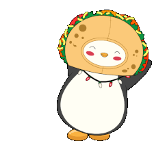 A cute Pudgy Penguin character happily wears a festive taco hat and a string of colorful lights around its neck.
