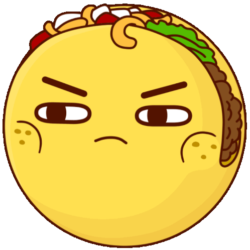 A cute, round cartoon taco with an angry facial expression, featuring classic taco fillings.