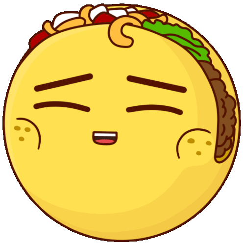 A cute, round yellow emoji face with closed eyes and a small smile, wearing a delicious taco as a hat.