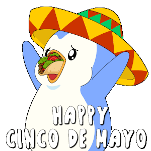 A happy penguin wearing a sombrero celebrates Cinco de Mayo by joyfully eating two delicious tacos.