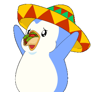 A cute penguin wearing a festive sombrero happily devours two delicious tacos, showcasing a love for Mexican cuisine.
