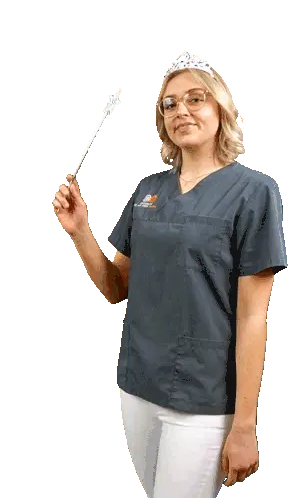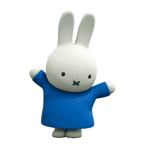 A cute bunny-like character in a blue shirt jumps cheerfully, exclaiming 'Tada Ta-da' with open arms.