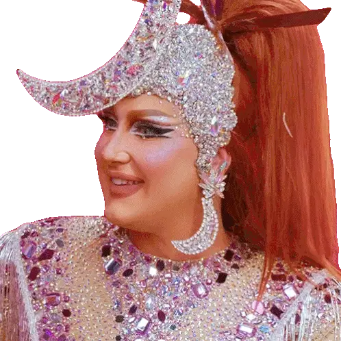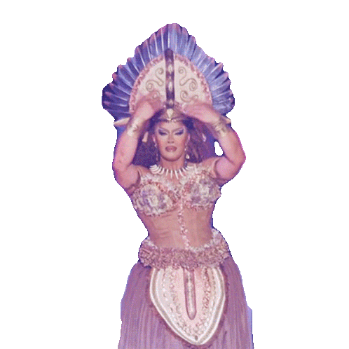 Kween Kong, the drag queen, performs a dramatic bow in her elaborate costume and feathered headpiece, acknowledging applause.