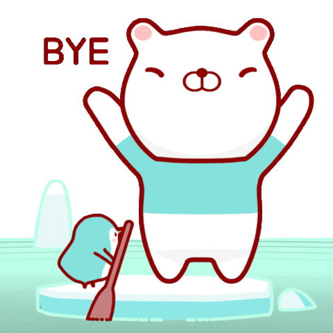 A cute polar bear waves goodbye with a small penguin friend, saying 'BYE' and wishing 'Take Care'.