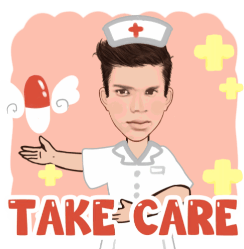 A male nurse character offers a glowing, winged healing pill with the message 'TAKE CARE', symbolizing health and well-being.