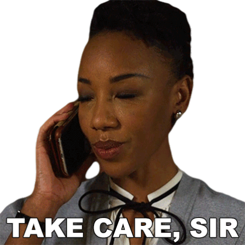 Carmen Moyo from The Good Fight on the phone, saying 'Take Care, Sir' with a professional demeanor.
