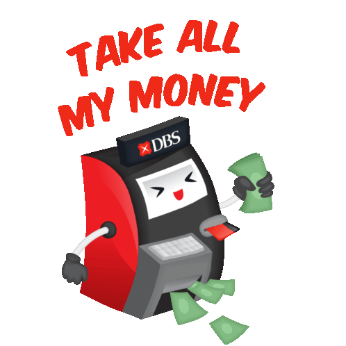 A cute DBS ATM character enthusiastically offers money, with the text 'TAKE ALL MY MONEY' above it.
