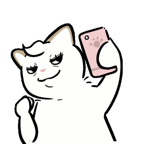 A confident white cartoon cat with a smug expression takes a selfie with a pink phone, holding a red heart.