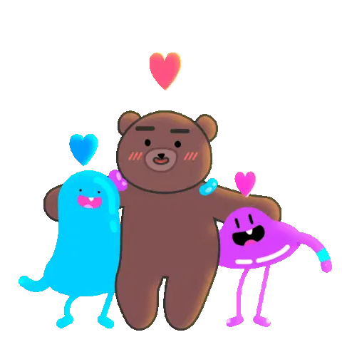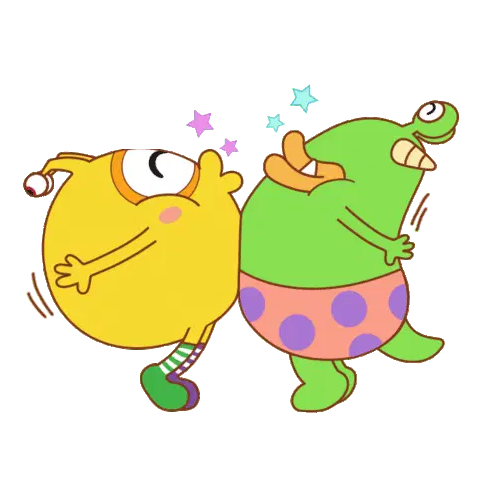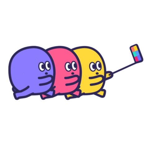 Three adorable cartoon characters, purple, pink, and yellow, walk together while taking a fun group selfie with a selfie stick.