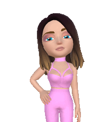 An animated avatar with ombre hair and a pink outfit makes a confident 'take that' pointing gesture, expressing triumph or challenge.
