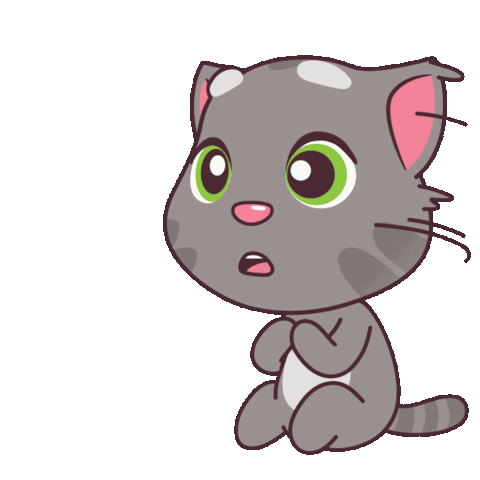 A cute cartoon cat, resembling Talking Tom, sits with wide eyes and an open mouth, looking surprised or taken aback.