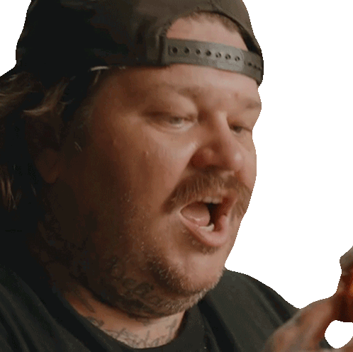 Matty Matheson enjoys a tasty bite of food, looking around with a satisfied expression.