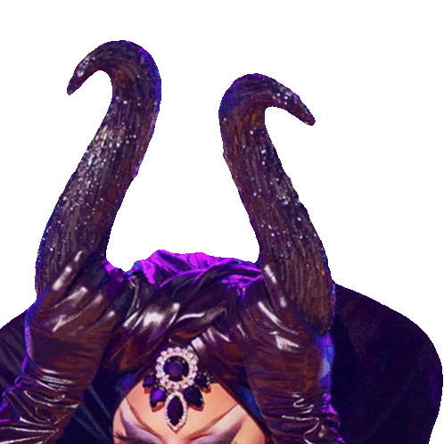 Eva Le Queen dramatically removes her large, dark horns, revealing her expressive face and elaborate drag makeup.