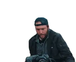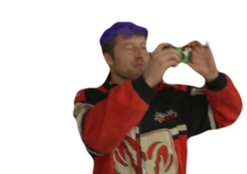 Scotty Sire, with purple hair and a racing jacket, holds a green disposable camera to take a picture.