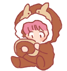 Takumi, a cute chibi character, snuggles in a cozy brown animal onesie, holding a round treat. Adorable animated sticker.