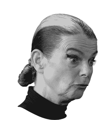 A pixelated, black and white image of a woman with her mouth wide open in a scream or shout, expressing extreme shock or surprise.