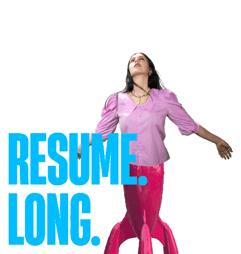 A woman in a pink blouse and rocket pants flies upwards, with the text "RESUME. LONG." in blue, representing "Talenten Pro Crazy Careers".