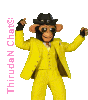 A pixelated chimpanzee in a yellow suit and black hat dances energetically, with 'ThirudaN Chat' text visible.