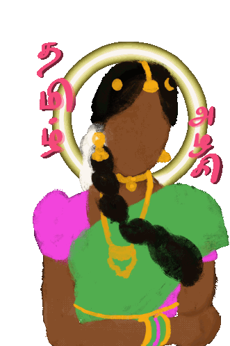 An illustrated sticker of a beautiful Tamil woman (Azhagi) in traditional attire, adorned with jewelry and a halo, featuring Tamil script.