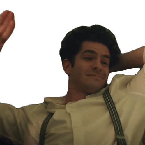 Andrew Garfield as Jon, from Tick Tick Boom, relaxing with a subtle smile, wearing a white shirt and suspenders.