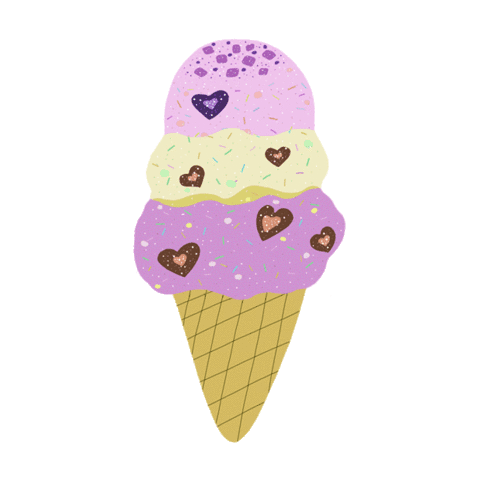 A delightful three-scoop ice cream cone featuring purple and yellow scoops, adorned with sprinkles and chocolate hearts.