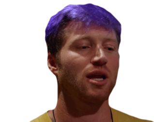 Scotty Sire with purple hair reacts with a disgusted expression while tasting something, smacking his lips.