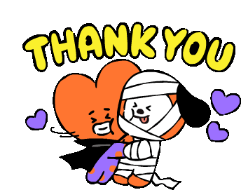 BT21's Tata and Chimmy share a warm hug, with Chimmy playfully wrapped like a mummy, expressing a heartfelt 'Thank You' with floating hearts.