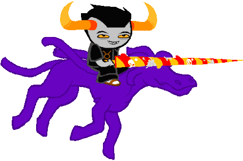 Tavros Nitram from Homestuck, a troll character, rides a purple unicorn while holding a jousting lance.