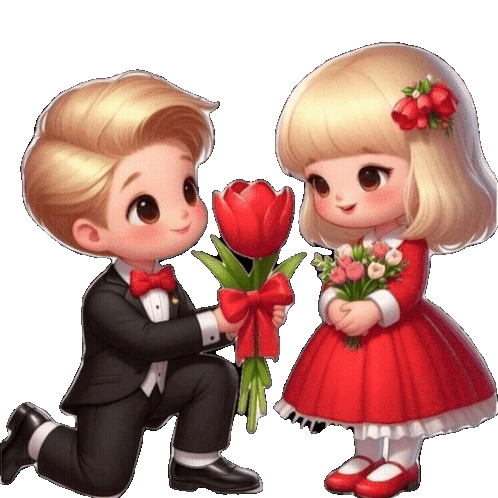 a boy in a tuxedo is kneeling down to give a girl flowers