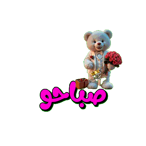A charming teddy bear in a suit holds red roses and a box of treats, wishing 'Good Morning' in Arabic.