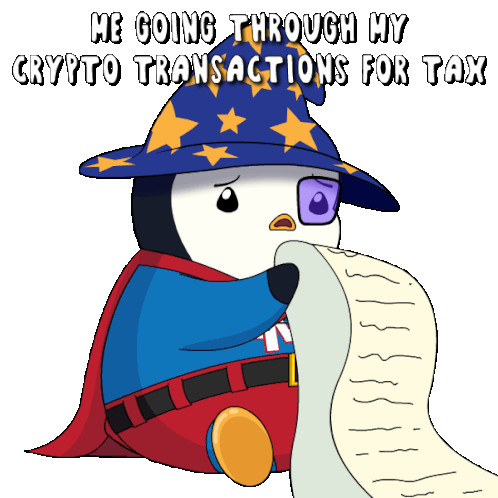 A worried Pudgy Penguin in a wizard hat reviews a long list of crypto transactions for tax preparation.