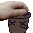 An animated pixel art sticker from TBF Trial By Fire, featuring a hand holding a cup with a dead pot face.