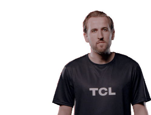 Harry Kane, the English footballer, nods with a serious expression while wearing a TCL branded t-shirt.