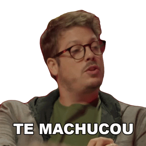Fabio Porchat, from Porta Dos Fundos, asks 'Te Machucou?' (Did it hurt you?), conveying concern or sarcasm.