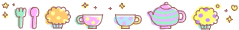 Animated pixel art banner featuring sparkling tea cups with pastel patterns on a white background, perfect for webcore aesthetics.
