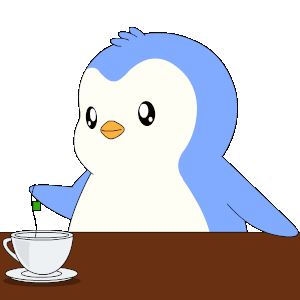 A cute penguin dips a Bitcoin coin into a teacup, a nod to 'GM' and Michael Saylor's crypto enthusiasm.