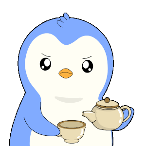 A nervous penguin holds a teapot and cup, pouring liquid while looking intrigued, symbolizing 'spilling the tea'.